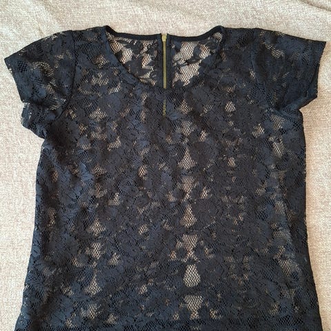 Läpikuultava musta kauluspaita. Materiaalista ei tietoa. Hyvin ohut läpikuultava materiaali. Pitsiä koristeena hihansuulla ja olkapäässä. Kissatalous. Postikulut eivät sisälly hintaan.