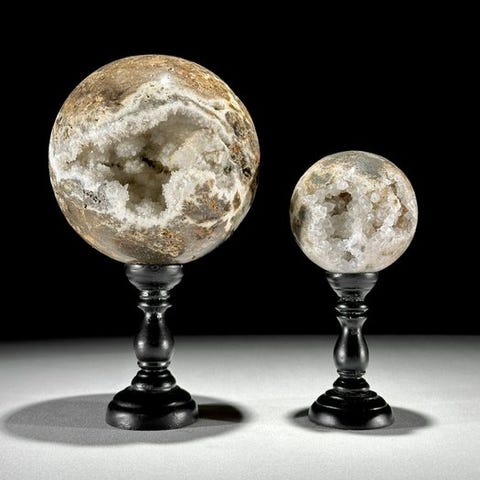 Kauniit kuutiomaiset kalkki-kristallikimpaleet ja kristallikvartsipallo, joissa on suuret piikit, jalustalla.