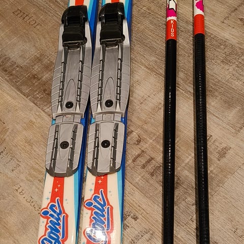 Myydään lasten 100cm sukset + sauvat. Siteet saa kenkiin kiinni ja siteitä saa säädettyä kengän koon mukaan.