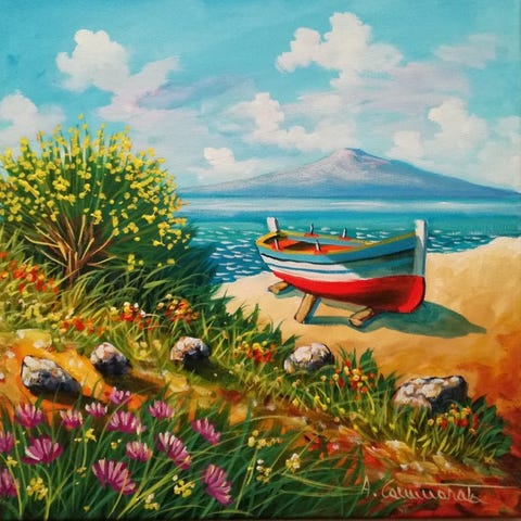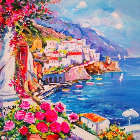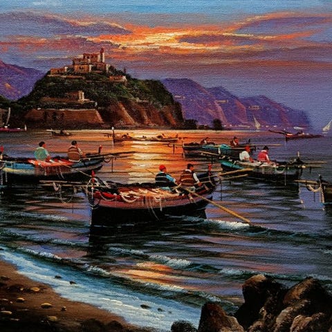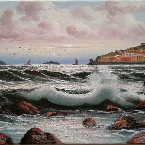 Kaunis ja upea öljymaalaus laudalla, mitat 30 x 40, mestarilta Giuseppe Luongolta. Esittää upeasti Napolin kulman (Palazzo Donn' Anna), erittäin kauniit värit ja erinomainen maalaustaito näkyvät selvästi. Alareunassa ja takana taiteilijan allekirjoitus. Peräisin yksityiskokoelmasta ja toimitus seurattavissa.