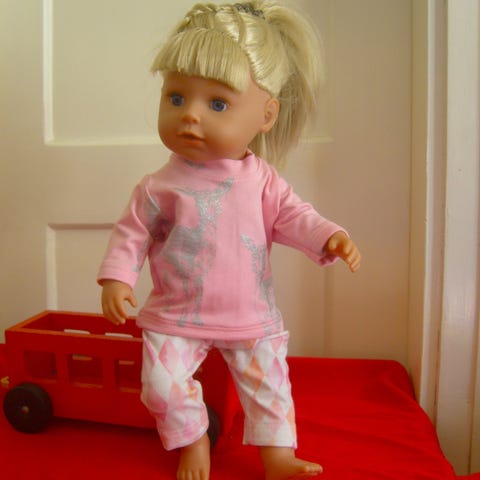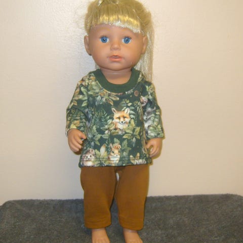 43 cm nukelle (baby born tai sister) trikoosta vaaleansininen aluspaita ja -housut. Paidassa takana pukemista helpottava tarrakiinnitys. Housuissa vyötäröllä kuminauha.