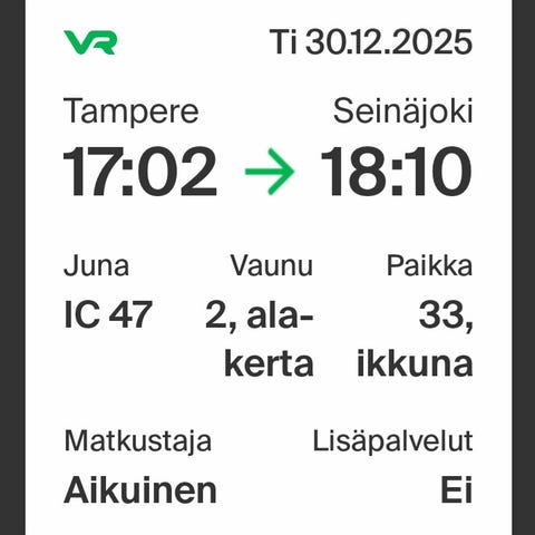Minulla myynnissä myös Tre-Seinäjoki junalippu 30.12.2025.