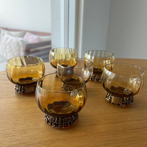 P. Paunila 1992 uniikki viinisarja, 6 kpl viinilasit ja karahvi vaaleanpunaisella värillä. Ostettu noin 2000 suoraan Paunilan hytin vitriinistä Riihimäeltä. Kaikki lasit sekä karahvi signeerattu, ja lasit numeroitu I-VI.