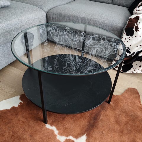 Kuvanmukainen sohvapöytä. Käytönjälkiä. Putsaaminen jää ostajalle