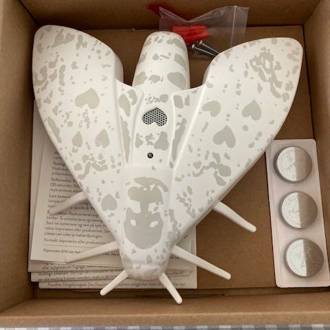 Yksi LENTO / Paola Suhonen palovaroitin. Ollut käytössä useamman vuoden, arviolta 5-6 vuotta. Tähän voi vaihtaa itse varoittimen uuteen, pitäen koristekuoren uuden varoittimen kanssa. Alkuperäinen paketti tarvikkeineen, proput ja ruuvit käyttämättömät. Optinen.