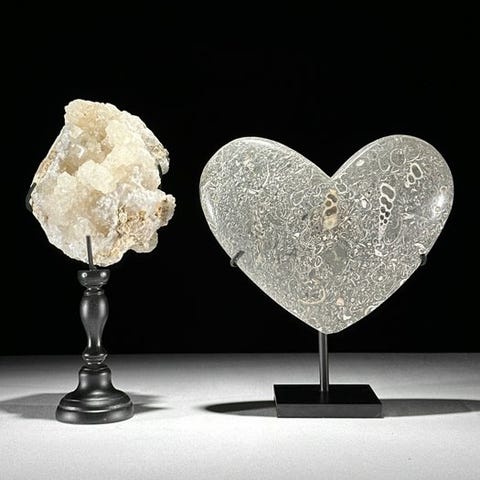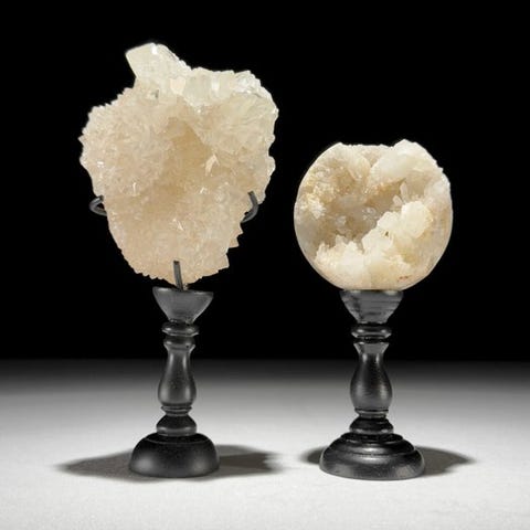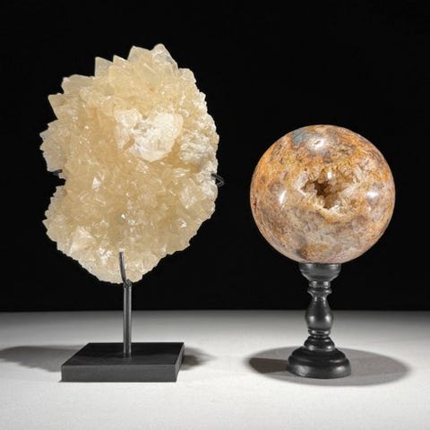 Upea pari kuutiokalsiittiryppää ja onyksipalloa räätälöidyillä jalustoilla.