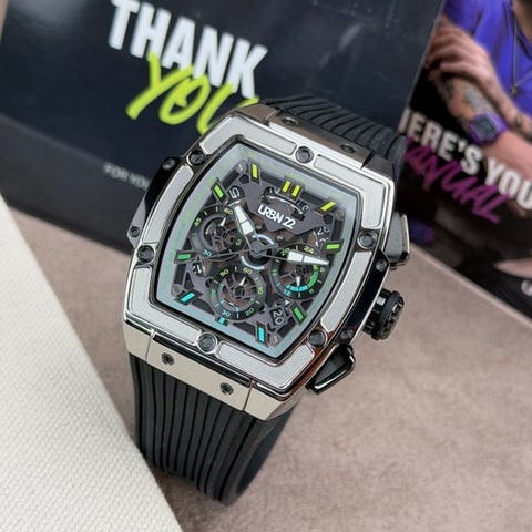 Huomiota herättävä URBN22-miesten rannekello. Kellossa on kvartsikoneisto (VD53 Japanista). Varustettu kronografilla, 24 tunnin näytöllä ja päivämääränäyttö klo 4–5 välillä. Näyttävä ulkonäkö kellon muodon, osittain avonaiseksi työstetyn kellotaulun ja värikkäiden yksityiskohtien ansiosta.
