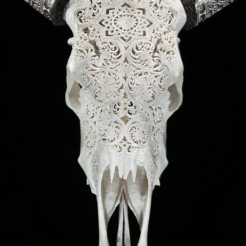 Tämä veistetty lehmän pääkallo on upea sisustuselementti, joka elävöittää minkä tahansa kodin tai ravintolan. Se ei ole vain henkinen ja kulttuurinen taideteos; se kertoo myös tarinan indonesialaisten alkuperäiskäsityöläisten perinteestä, jotka säilyttävät paikallisen käytännön käyttää jokainen osa eläimestä luodakseen ikuisen taideteoksen. Tämä pääkallo on käsityönä tehty Indonesiassa, missä kaiverrustaito eläinten pääkalloihin siirtyy isältä pojalle. He ovat hallitseet tätä ovelaa tekniikkaa ja tarvitsevat noin 5–6 päivää yksityiskohtaisten kaiverrusten, kuten tämän mallin, tekemiseen. Sarvet on myös veistetty boheemityylisesti.