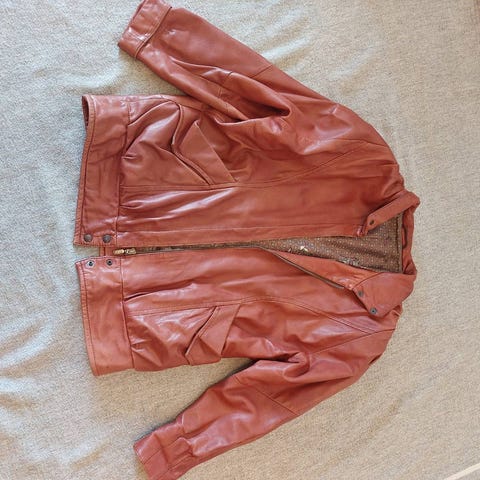 Nahkatakki. Koko 3, vastannee kokoa 40. Väri vaaleanruskea. Selkäpituus kauluksen alareunasta takin helmaan 78cm. Siisti vuori.