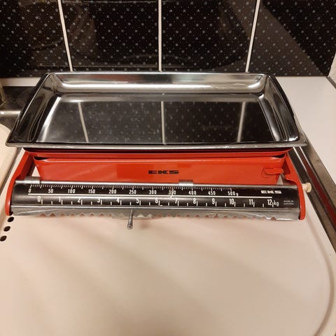 Toimiva vaaka, toimii yhdellä nappiparistolla. Max 5kg.