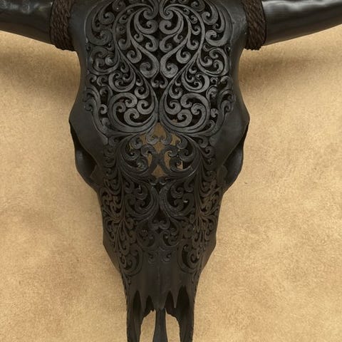 Suuri käsin kaiverrettu härän pää, jonka ovat kaivertaneet taiteilijat, jotka ovat siirtäneet muinaisen kaiverrustaidon isältä pojalle.