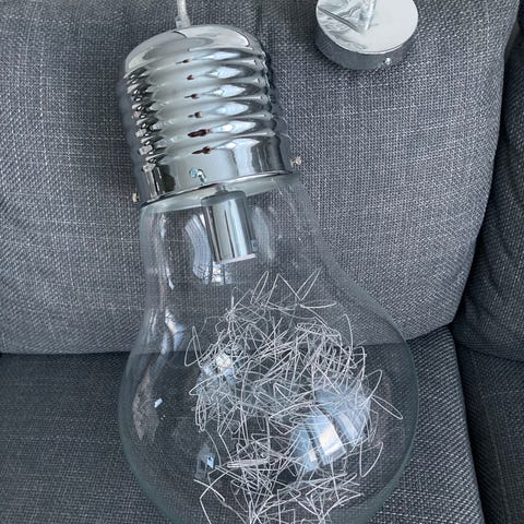 Värikäs ja hauska kattovalaisin. Varjostin on kirpputorilöydöistä itse rakennettu, kaikki sähköosat ovat uusia ja standardien mukaisia. Korkeus 41 cm, halkaisija 54 cm, johto 1,3 m. Lampun kanta E27. MMM