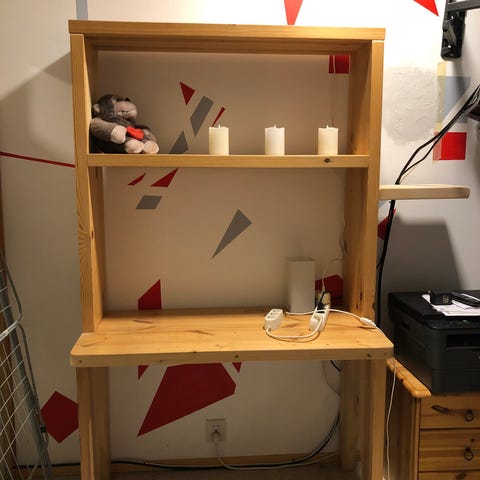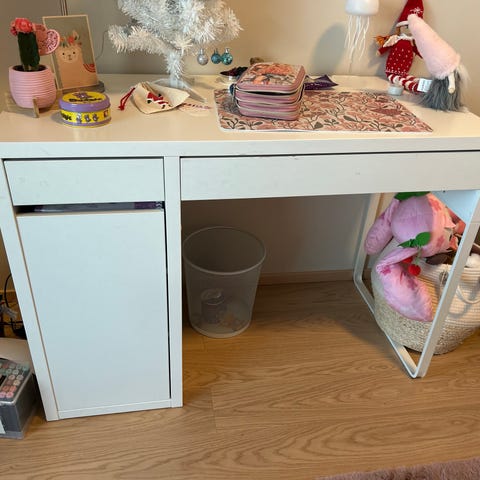 Pinnaltansa siisti L-muotoinen sivutaso lisätilaksi kirjoituspöytään. Tukijalassa on pieni reikä, ei näy päällepäin.