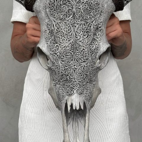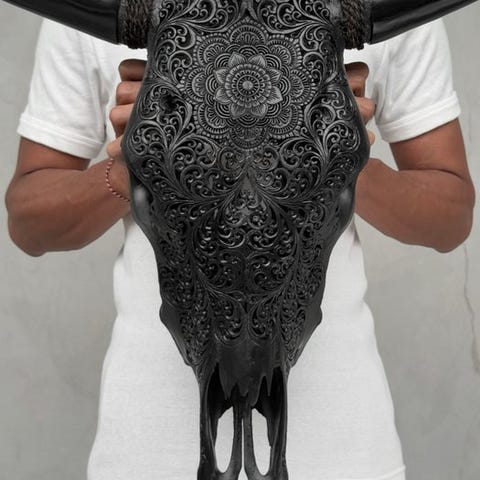 Käsin kaiverrettu lehmänkallo, jonka ovat kaivertaneet käsityöläiset, jotka siirsivät muinaisen kaiverrustaidon isältä pojalle. Kallo on veistetty kokonaan käsin huolella. Se on epätavallinen, koristeellinen kappale.
