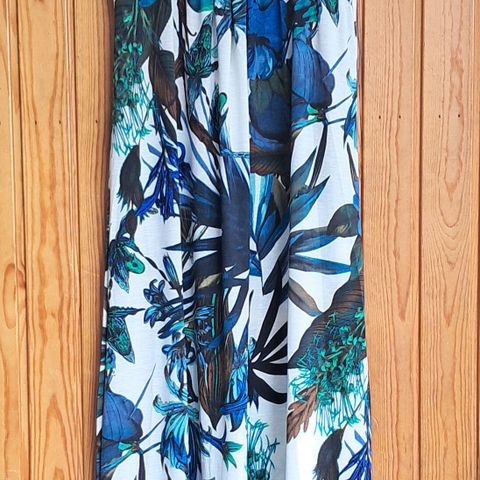 Värikäs, pitkä kesämekko. Koko- tai materiaalilappuja ei ole. Ulkomailta ostettu, ja vastaa kokoa m tai pieni L. Materiaali jotakin puuvilasekoitetta sormituntumalla.