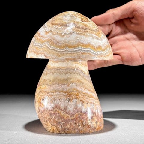 Täydellinen keräilijöille ja luonnon taiteen harrastajille, tämä veistos vangitsee sienten leikkisän viehätyksen, jotka usein liittyvät taianomaisiin metsiin ja kansantarinoihin. Kiillotettu viimeistely korostaa kiven luonnollisia sävyjä, luoden kiehtovan koriste-esineen kotiisi tai toimistoosi.