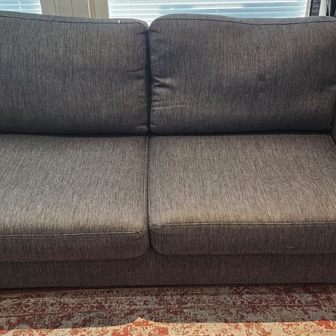 Myydään muuton tieltä harmaa, Askosta ostettu, 3-istuttava kangassohva. Hyvässä kunnossa, päälliset ovat irrotettavat ja ne voi pestä. Metalliset jalat.
