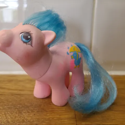 My Little Ponyn kaltainen pienikokoinen ponilelu, jossa on pinkki runko ja monivärinen harja. Lelu on vanha joten jälkiä on, kuten kuvista näkee.