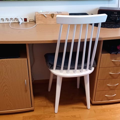 Pöytätasosta puusta löytyy käytön jälkeä (ks kuvat), mutta saa varmasti peittoon esim. mustalla tussilla/maalilla.