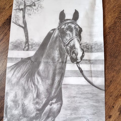 Tämä on Elizabeth Ardenin vintage Blue Grass -parfyymipullo, joka on muotoiltu hevosen figuuriksi. Alkuperäinen Blue Grass -tuoksu lanseerattiin vuonna 1934, ja se oli saanut inspiraationsa laitumista, joissa Elizabeth Arden kasvatti kilpahevosiaan. Hevosaihe oli yleinen teema Elizabeth Ardenin mainonnassa ja tuotteissa.