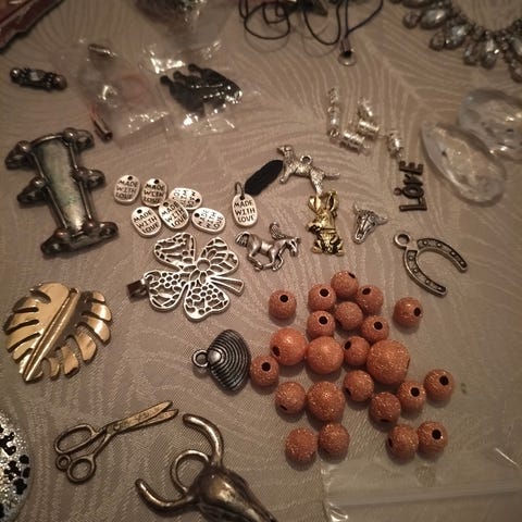Korujen valmistukseen tarkoitettu setti, joka sisältää erilaisia pieniä helmiä eri väreissä, metallisia koristeosia ja korvakorukoukut. Lisäksi Happy Birthday koristenauha. Yhteishinta 7€