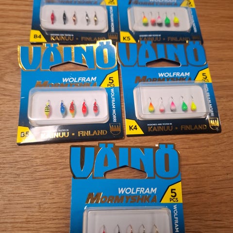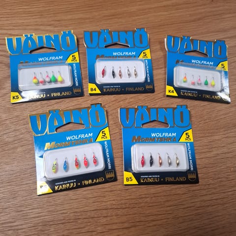 Väinö Wolfram Mormyska -kalastusmormyskat, 2 kappaleen pakkauksissa eri väreillä. Valmistettu wolframista, käytettävä kalastukseen. Saatavilla useita värejä ja kokoja.