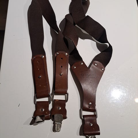 Täyttä nahkaa olevat mustat säädettävät henkselit. Kuvan mukaisesti säädettynä pituus 86cm, leveys 2cm.