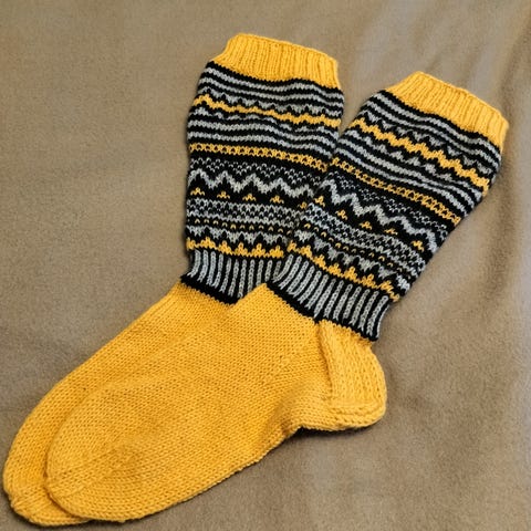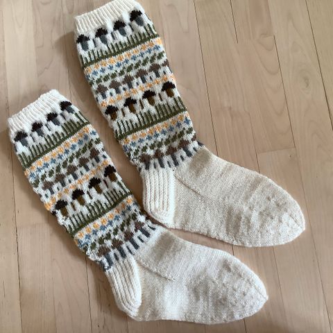 Uudet kirjoneulevillasukat 7 veljestä -lankaa noin 38 koon jalalle. Varren pituus 40cm.