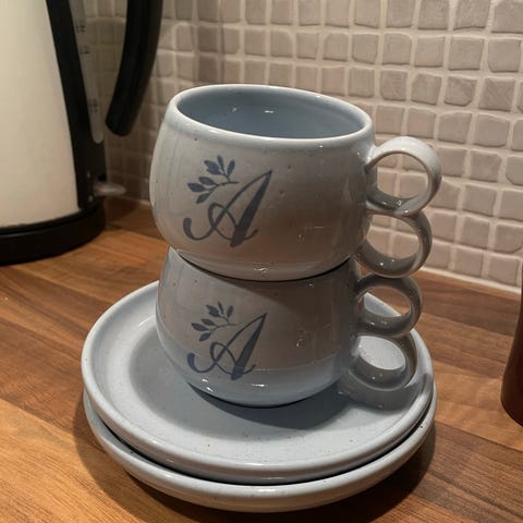 Pentikin astioita. Kahvimukeja 3 kpl, asetteja 7 kpl ( käytetty enemmän) ja jalallinen kakku/leivoslautanen sekä kermakko.