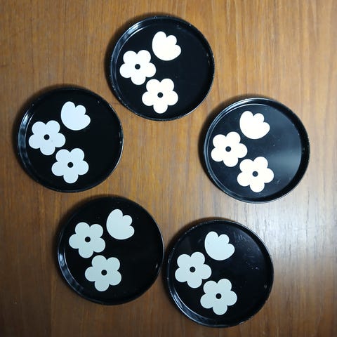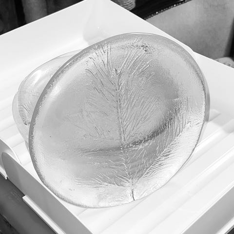 Kaija Aarikan Heiniä Kainalossa-sarjan suuret lasilautaset. Lähes ellei täysin käyttämättömät. Kuva-aiheet vaihtelevat mm. sinivuokko, havu, heinät