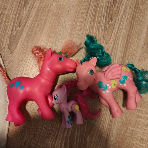 Setissä 8 ponia, 5 eri hahmoa. Yhdellä taittuvat nivelet ja nimi kirjoitettu vatsaan. Muissa ei merkintöjä.