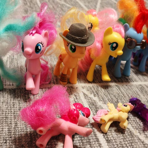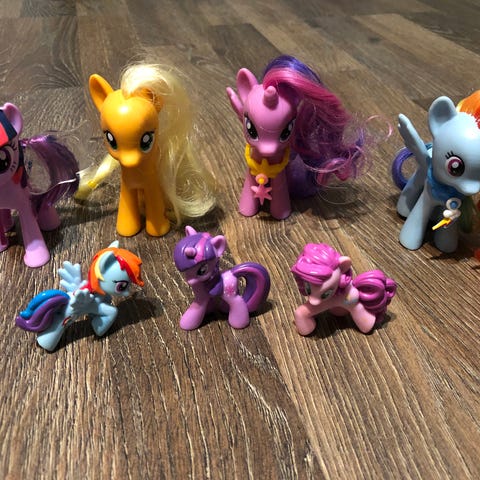 My Little Pony lasten lelut, useita värikkäitä ponihahmoja eri kokoisina. Lelut on valmistettu muovista ja sopivat lasten leikkeihin.