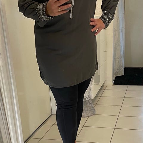 Mim Kaunis harmaa juhlamekko,mekko jossa hihat ohutta kangasta (kuultaa vähän läpi) ja hihansuissa kauniit timantti ja helmi koristelut. Mekossa on vuori. Takana niskassa pieni nappi. Koko 48.