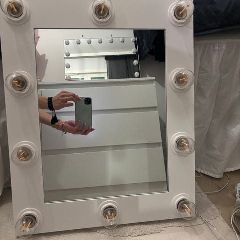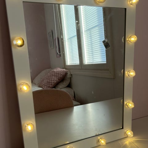 Clas Ohlsonin meikkipeili, kuin uusi. Koko 46 x 36 cm. Peilin voi ripustaa seinälle tai asettaa pystyyn pöydälle. Toimii paristoilla tai muuntajalla.