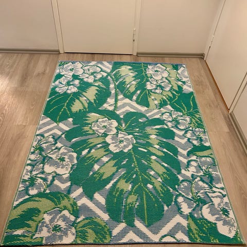 Askosta aikoinaan ostettu ei-nukkainen mustanharmaa eteismatto. Pituus n. 2 metriä, on mattoleikkurilla toisesta päästä kerran lyhennetty kun päätykanttaus rikkoutui, nyt tarvis leikata (ja halutessa kantattava) uudelleen kun n. 10 cm matkalta pohjan kumi murentunut). Kuvassa olevassa päädyssä on ehjä kanttaus. Pesulla saa täysin siistin, ja mattoleikkurilla leikatun reunan voi vaikka peittää kynnysmatolla halutessa.