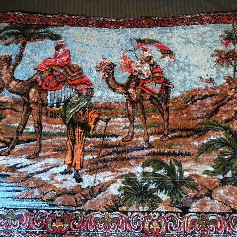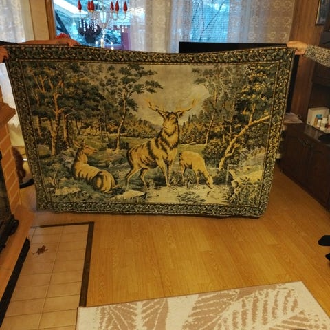 Gopeliini,jossa metsäaiheinen kuva peuroista ja luonnonmaisemasta. Gopeliinissa on värikäs ja yksityiskohtainen kuviointi, joka lisää koristeellisuutta. Sopii sisustukseen ja tuomaan luonnonläheistä tunnelmaa. Hapsutetut päät. Voin lähettääkin lähetyskulut lisätään hintaan.
