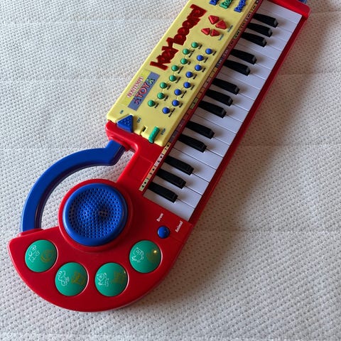 Sähköpiano, jossa sinimusta muovirunko. Sisältää useita säätimiä ja kaiuttimet. Kompakti koko ja kevyt rakenne. Toimii paristoilla. Ehjä mutta koskettimet kellastuneet.