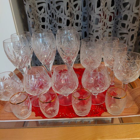 Kristallilasi pikarit, 6 kappaletta. Lasit ovat kirkasta kristallia ja niissä on koristeellinen leikattu kuviointi. Kaikki yhteensä 20,-.