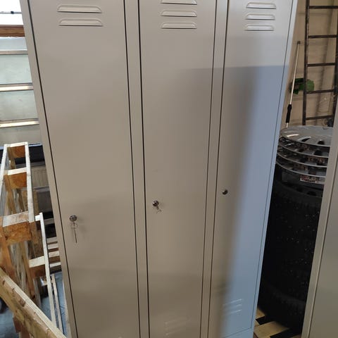 Peltinen kaksiosainen lukollinen pukukaappi hattuhyllyllä. Kason valmistama kotimainen laatutuote. Pientä käytön jälkeä näkyvissä.