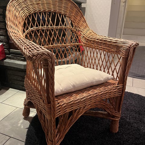 Rottinkituoli valkoisella pehmusteella. Pehmuste ostettu vuonna 2021 Parolan Rottingilta vanhan tilalle, rottinkiosa vanhempi, mutta hyväkuntoinen ja siisti. Pehmuste myös siisti, oikein tarkalla syynäyksellä paikansin pari ihan pientä hailakkaa tahraa. Savuton koti, ei lemmikkejä. Joudun luopumaan tuolista tilanpuutteen vuoksi.
