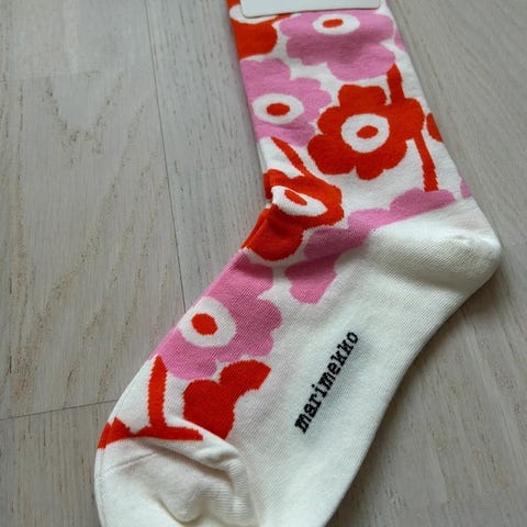 Myynnissä kahdet uudet Marimekon sukat (Kasvaa Pulloposti- ja Kasvaa Tasaraita Unikko-sukat koko 37-39 molemmissa) yhteishintaan 19e.