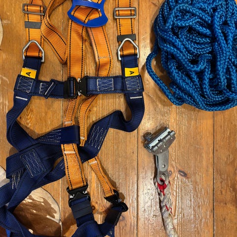 Kuvan mukaan lantiovyö ja köysiä/lukkoja