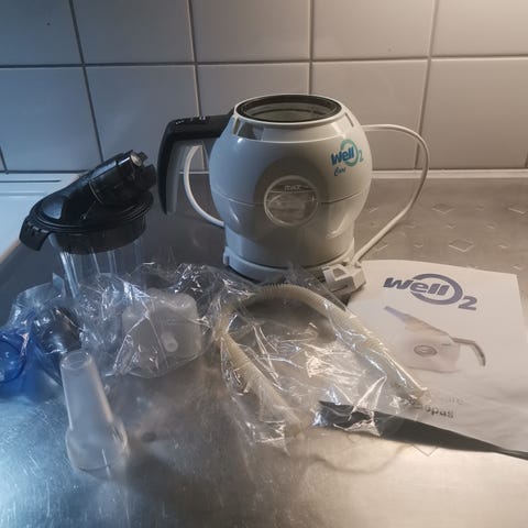 WellO2 Care hengitysharjoitin, joka sisältää laitteen, letkut ja erilaiset suukappaleet. Laite on suunniteltu hengitysharjoitteluun ja sen mukana tulee käyttöohjeet.