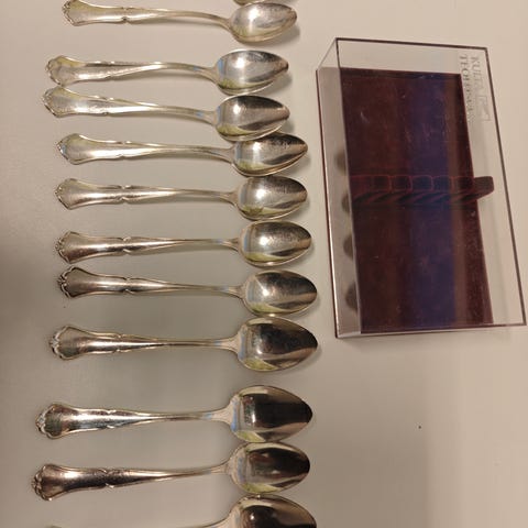 Käyttämättömät Chippendale salaatinottimet. Hopeaa.