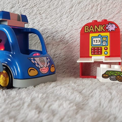 LEGO DUPLO City poliisiauto ja moottoripyörä leikkisetti sisältää sinisen auton, sinisen poliisimoottoripyörän, poliisihahmon, poliisiaseman sekä liikennemerkin.