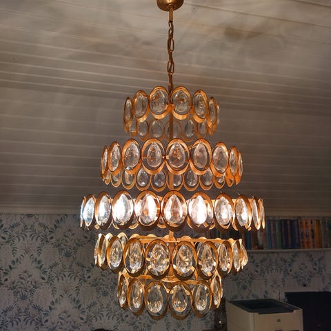 Kattokruunu / kristallikruunu, jossa on useita kristallikoristeita ja kuusi varjostinta. Toimiva. Espoossa. Nouto