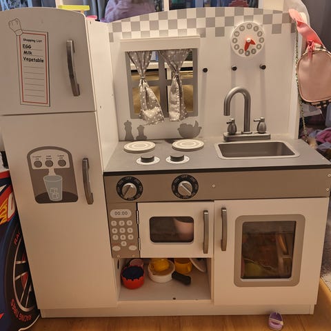 Kaksipuolinen leikkikeittiö + kassakone, leikkiruokia ja astioita. Yksi harmaa pystyputki ei ole alkuperäinen, mutta ei haittaa käyttöä.