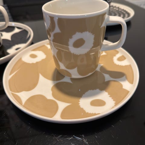 Marimekon musta unikko kahvikuppi ja lautanen.
