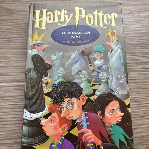 Kovakantinen J.K. Rowlingin teos Harry Potter ja viisasten kivi englanninkielisenä versiona.