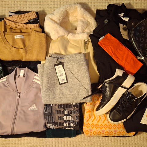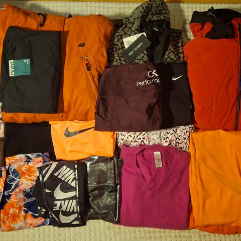 2kpl kevytuntuvatakki, Peak Performance softshelltakki, Under Armour tekoturkis, h&m pitkähihainen ja cropattu huppari, jouluinen tunika, cropattu toppi, Marimekko toppi ja kaulahuivi, Adidas huppari ja pitkä t-paita, Nosh pitkä neule ja musta hame, pinkki mekko, GANT musta mekko, farkut, Nike housuhame, vaaleanpunainen pipo, 2kpl käsilaukku, 2kpl pikkulaukku, meikkipussi, Converset (koko 36,5), kaulahuivi, Löffer uudet ja käyttämättömät kerrastohousut.